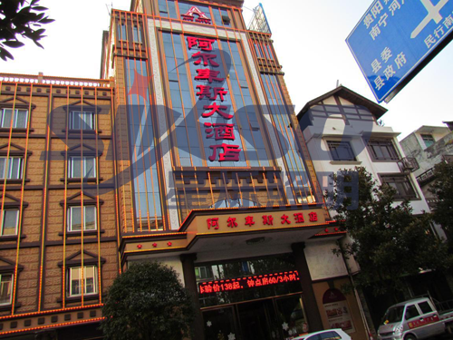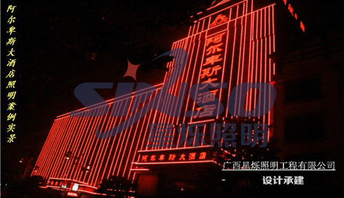 星爍照明決定使用單紅色,保持與中部大樓相同色調(diào),易于識(shí)別記憶。配合自有先進(jìn)的控制技術(shù),自主設(shè)計(jì)并實(shí)現(xiàn)12種3D立體動(dòng)畫效果,無(wú)人值守,自動(dòng)運(yùn)行。使酒店在當(dāng)?shù)赝砩嫌葹橥怀?,成為?dāng)?shù)匾咕暗貥?biāo)。