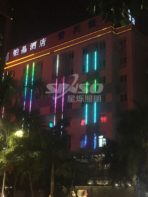 因酒店周圍有居民住房,兩側(cè)不宜使用較炫麗的色彩,我們以黃色的燈管對酒店樓體的輪廓進行裝飾,與周圍建筑相結(jié)合,突出主題。廣西星爍照明,擁有專業(yè)的設(shè)計優(yōu)勢,多年項目施工經(jīng)驗,完善的售后服務(wù).具備照明產(chǎn)品開發(fā)設(shè)計生產(chǎn)實力,承接亮化工程,樓體亮化,景觀亮化,外墻亮化,小區(qū)亮化等,廣西星爍照明歡迎您,熱線電話:0771-2865980