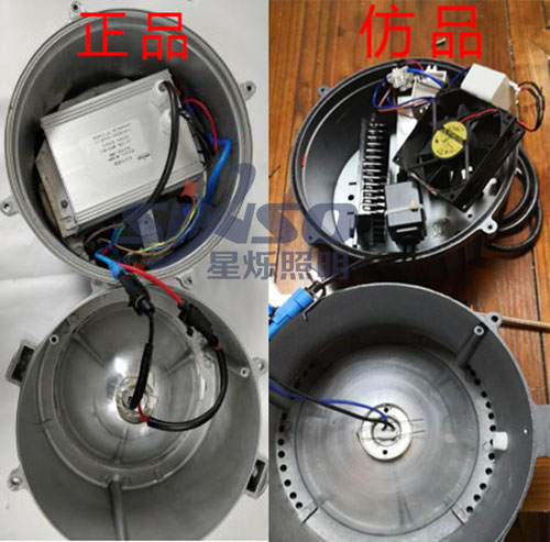 ◆右側(cè)仿品,用便宜的直流安定器+開(kāi)關(guān)電源,隨意堆放的元器件,外殼上有孔洞,雨水空氣可進(jìn)入,安裝都是用扎帶及雙面膠之類的固定,容易造成短路,安全隱患大。