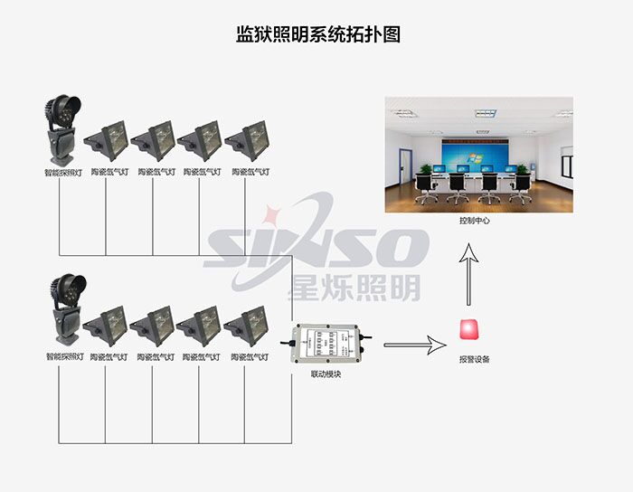 安裝在監(jiān)獄及看守所獄墻警戒區(qū)內(nèi),實(shí)現(xiàn)對警戒區(qū)的入侵照明報(bào)警。采用燈具與報(bào)警設(shè)備聯(lián)動(dòng)的方式,當(dāng)入侵目標(biāo)靠近警戒線后立即觸發(fā)報(bào)警,目標(biāo)區(qū)域周圍的智能探照燈會(huì)迅速亮起并跟蹤入侵目標(biāo),為看守士兵提供照明輔助,目標(biāo)區(qū)域陶瓷氙氣燈會(huì)自動(dòng)開啟強(qiáng)光頻閃模式,起到強(qiáng)光致盲效果,讓入侵目標(biāo)喪失行動(dòng)能力.