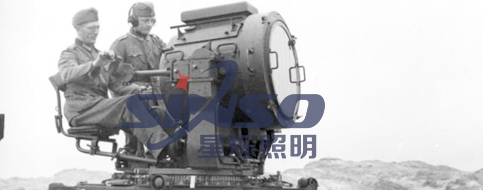 二次大戰(zhàn)時期通用電氣制造的探照燈使用陀螺儀式的燈架,直徑達152.4 厘米鍍銠的盤狀凹面鏡,尖峰輸出達 8億蠋光的碳電弧光源,專用的 15 千瓦的發(fā)電機,有效照距可達 45 到 56 公里。