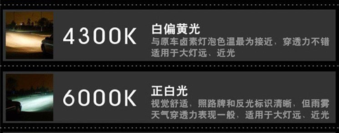 黃金光的色溫值是3000K,黃白光的色溫值是4300K,超白光的色溫值是6000K,藍(lán)白光是8000K。氙氣燈色溫一般在3000K——8000甚至更高。不同色溫的燈泡,其顏色、亮度均不一樣。色溫低的燈泡其光線偏黃,雨霧天穿透力強(qiáng);色溫高的燈泡其光線偏黃,但穿透力沒有黃色光好。可調(diào)色溫:目前市場(chǎng)上的HID產(chǎn)品,不管是改裝HID車還是原裝HID燈,色溫都是不能變化的。而可調(diào)色溫氙氣燈突破了這一技術(shù)瓶頸,可以實(shí)現(xiàn)消費(fèi)者在平時(shí)享受超白光,在雨霧天的時(shí)候,享受穿透性強(qiáng)的黃白光(和原裝氙氣燈顏色一致)??烧{(diào)色溫的原理:可以調(diào)節(jié)色溫的專用HID光源 可調(diào)色溫專用的高效率超蒲安定器,實(shí)現(xiàn)燈光的顏色和亮度同時(shí)發(fā)生變化!