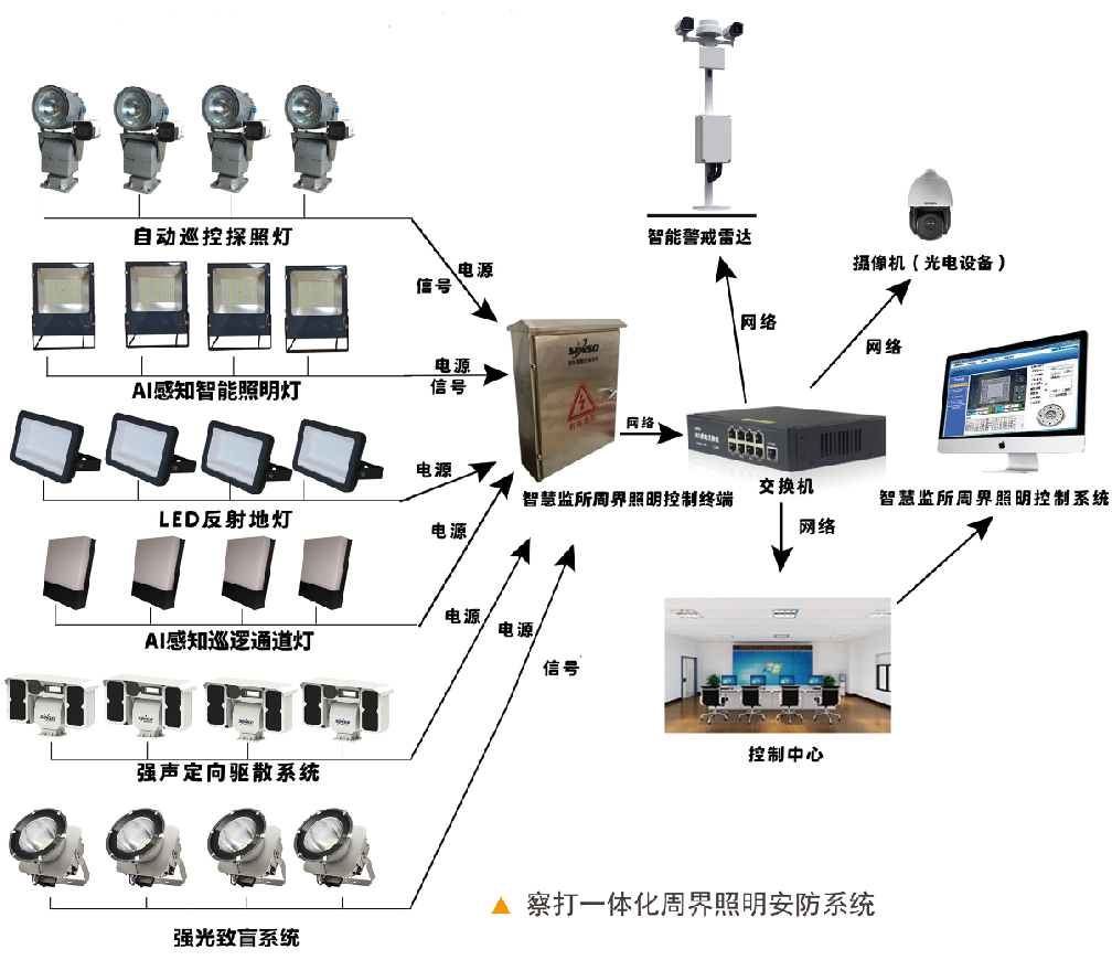 察打一體化周界照明安防系統(tǒng)由:超腦網(wǎng)絡(luò)探照燈、AI感知智能照明燈、警戒區(qū)專用LED反射地?zé)?、AI感知巡邏通道燈、強(qiáng)聲定向驅(qū)散系統(tǒng)、強(qiáng)光致盲系統(tǒng)、智慧監(jiān)所周界照明控制終端、智慧監(jiān)所周界照明控制系統(tǒng)所構(gòu)成。