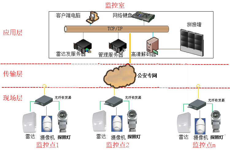 整個(gè)系統(tǒng)分為現(xiàn)場層、傳輸層、應(yīng)用層三大部分。系統(tǒng)通過部署在邊境沿線上的各個(gè)雷達(dá)設(shè)備,實(shí)時(shí)對人員、車輛非法入侵進(jìn)行掃描。同時(shí),安防監(jiān)視雷達(dá)的報(bào)警信號與超腦網(wǎng)絡(luò)探照燈、視頻監(jiān)控視頻系統(tǒng)進(jìn)行聯(lián)動,并通過以太網(wǎng)交換機(jī)把報(bào)警信號發(fā)送給監(jiān)控室,系統(tǒng)收到告警信息后,自動將報(bào)警畫面切換到目標(biāo)攝像頭的監(jiān)控畫面上,同時(shí)GIS系統(tǒng)(衛(wèi)星地圖)顯示報(bào)警地點(diǎn),供值班人員進(jìn)行現(xiàn)場畫面的查看,進(jìn)一步確認(rèn)現(xiàn)場實(shí)際入侵情況。系統(tǒng)結(jié)構(gòu)圖詳見下圖。
